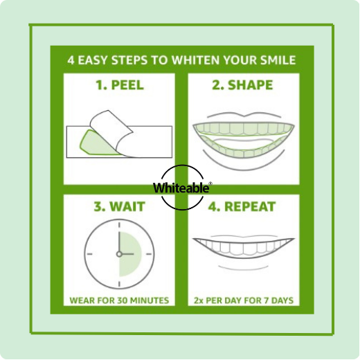 Directions: Enjoy whiter teeth in just 7 days. Simply peel, shape, wait, and repeat. For optimal results, use twice daily for 30 minute